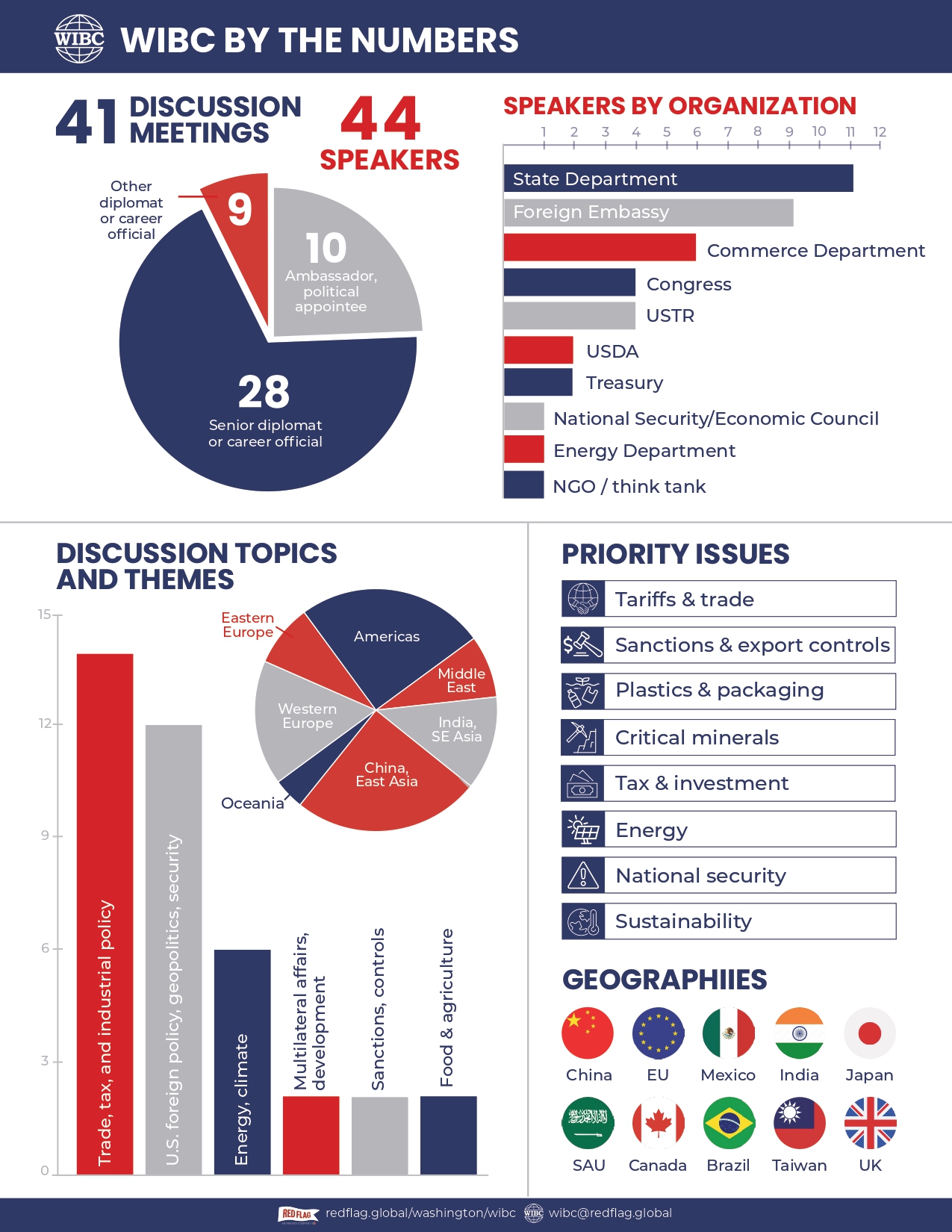 Our service in Washington also includes the Washington International Business Council (WIBC), established in 1974. For nearly four decades, clients have relied on WIBC for unique, strictly off-the-record engagements with decision makers at the most senior levels of the U.S. executive and legislative branches, as well as foreign embassies and international organizations. WIBC comprises senior executives from more than 50 leading corporations across a wide variety of sectors. WIBC participation also offers access to Red Flag’s custom consulting services and regular reporting on the policy developments, personnel moves, and news driving risks and opportunities for businesses in the United States and around the world.